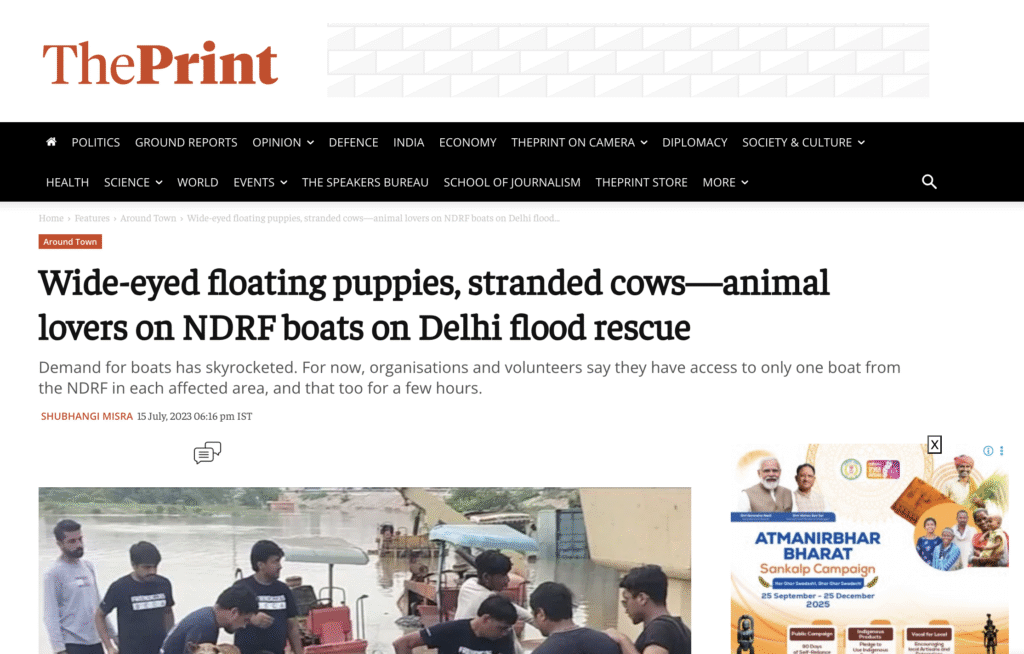 Rescues animals during Delhi/NCR floods with NDRF boats.